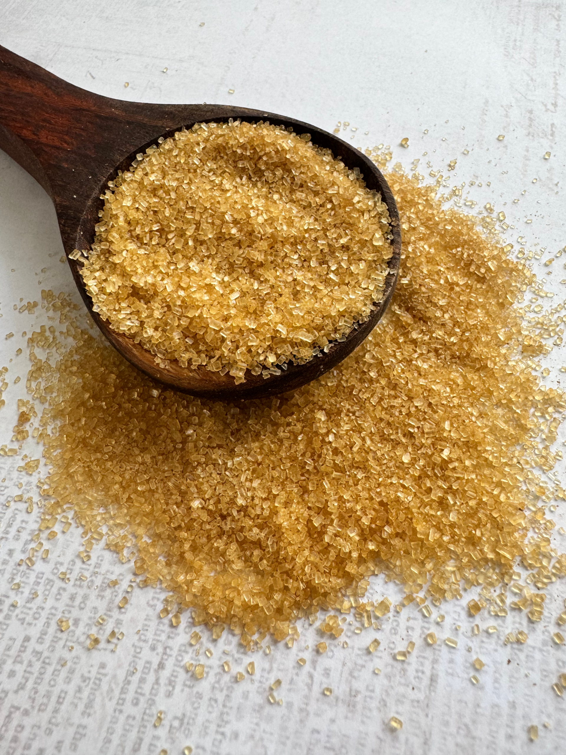 Demerara sugar are medium-sized crystals of deeper golden brown colour and it has a deep caramel flavour. It has an incredibly crunchy texture and is considered a minimally processed sugar, offering a more natural option for sweetening.